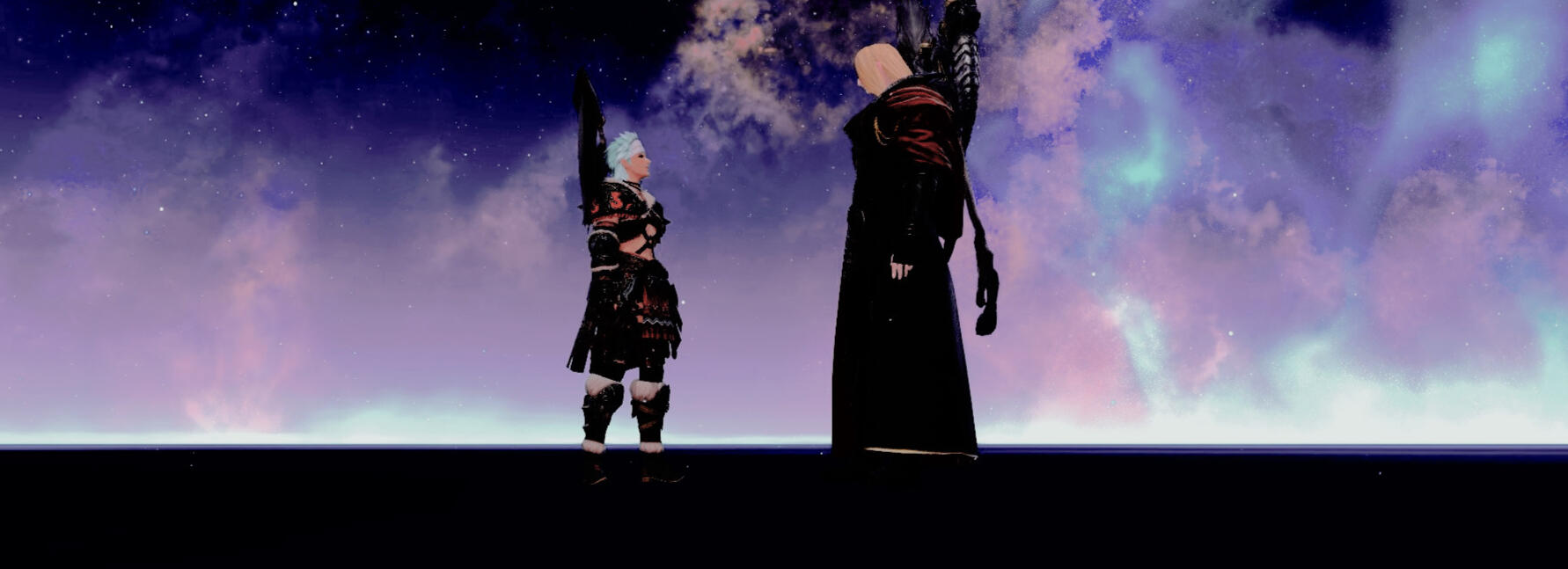 Suddenly, her vision came back, the breath in her lungs returned and her aether had been physically restored. Minya now stood in a field of Elpis flowers, her friends that had sacrificed themselves now at her side. Across from her was Meteion on her knees and Claude who was accompanied by two familiar faces, Hythlodaeus and Azem. Some how, some way, Claude managed to wish back his friends with Azem's crystal.Here, our heroes progress into the Dead Ends after a conversation with Azem and Hythlodaeus. This expedition is lead by Meteion who tells the stories of each lost world that met their ends due to potent despair. The party is not shaken and continues to show unwavering resolve through the worlds they visit within this dynamis egg.Reaching the end of the Dead Ends, the Meteia flock together to form the ultimate personification of despair, the Endsinger. She spares the group no time to react, she begins conjuring planets and launching them upon the group. Just when they believed they could withstand no more, Endsinger halts her assault as she senses another presence.Four glass shattering echos begin to crack in the sky above them, out of nowhere the space breaks open— and out of the hole that is formed— a gargantuan, black dragon flies through. In this rendition, this dragon is not Shinryu, but one of our own named Ancalagon. With him he brings Zenos who had struck a bargain with him to get here, after all, he is pining for Minya and wants only to challenge her.Though before Zenos can get what he wants, Minya and co. need to defeat Endsinger. Zenos and Ancalagon agree to assist our heroes by providing a platform to battle her upon.